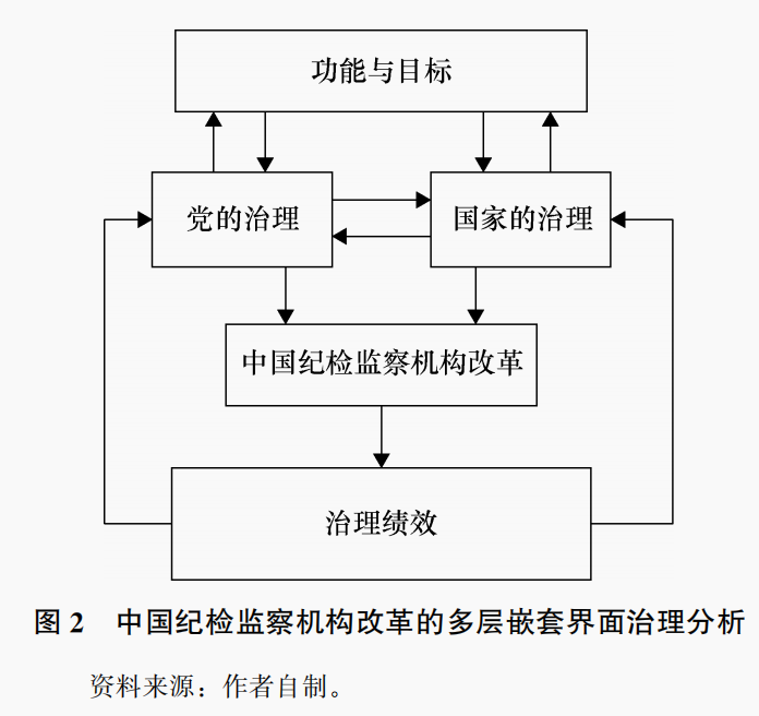 机构改革的治理逻辑,将党和国家监督体系作为国家治理体系和治理能力现代化的重要组成部分和实现手段,探究纪检监察机构、监督体系和国家治理现代化的三者有机统一。从这个意义上看,治党和治国逻辑双轮驱动的纪检监察机构改革就是要回应新的时代命题,通过重新整合组织的任务、职责和使命,推动完善党和国家监督制度体系,实现国家治理体系和治理能力现代化。从纪检监督机构到党和国家监督体系,再到国家治理体系和治理能力现代化,这也体现了多层嵌套界面治理的逻辑。这说明,界面治理本身是一个复杂系统,它由子系统和要素构成,子系统之间关系也是实现系统功能的重要影响因素,这正是体系的内涵所在。