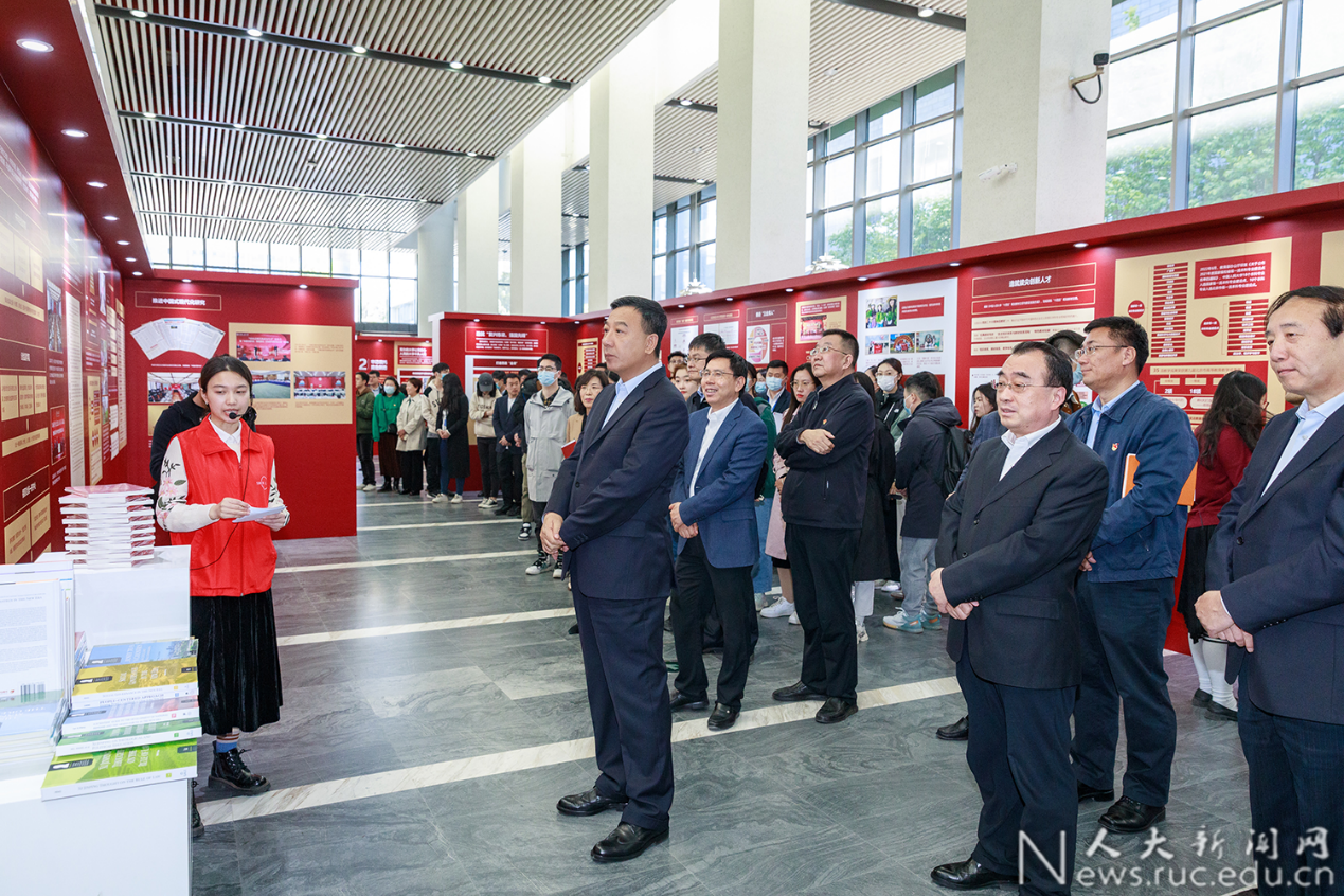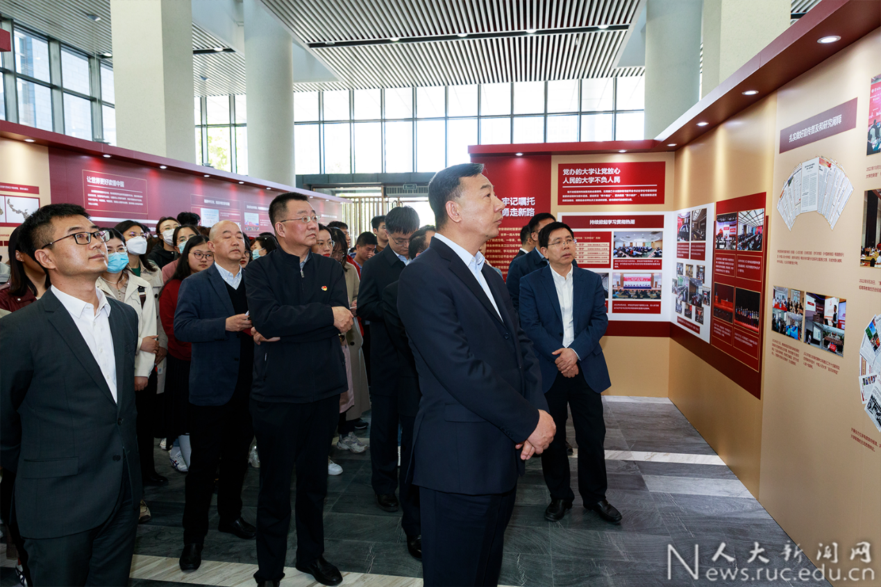 的特殊关心、对人大师生的亲切关怀,从“党办的大学让党放心、人民的大学不负人民”“造就‘复兴栋梁、强国先锋’”“扎根中国大地,坚守‘独树一帜’”“打造我国人文社会科学研究和教学领域的重要人才中心和创新高地”“传承红色基因”“让世界更好读懂中国”等方面全面展示了学校一年来学习宣传贯彻习近平总书记在学校考察调研时重要讲话精神的主要工作和重要成效,展望了学校今后5年和到2037年事业发展的奋斗目标和战略规划。展览还设立“参观打卡区”“互动学习区”,并推出线上展览,有效增强了展览的可及性,提升了师生的体验性、互动性、参与感,提高了展览的教育效果、传播效果。